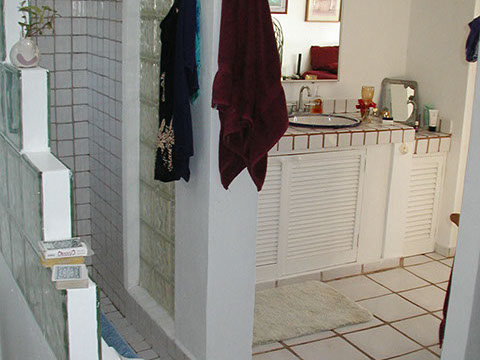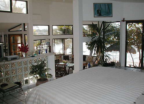 The dining room is created from a huge bay window that looks out over the cove. The bedroom lies behind a wall of glass that sits just above the kitchen. The bedroom boasts a sunken tub that looks out over the cove. Imagine yourself soaking in this tub listening to the gentle waves lap on our shoreline..... The house also offers a great view out French doors to the patio and the beach 12 feet beyond.